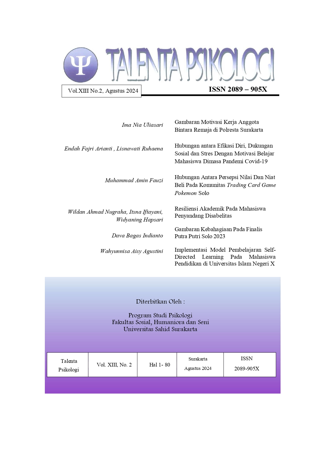Pada bagian awal berisi artikel dengan judul Gambaran Motivasi Kerja Anggota Bintara Remaja di Polresta Surakarta. Selanjutnya, judul artikel kedua kami yakni, Hubungan antara Efikasi Diri, Dukungan Sosial dan Stres Dengan Motivasi Belajar Mahasiswa Dimasa Pandemi Covid-19. Pada artikel selanjutnya kami menyajikan artikel dengan judul Hubungan Antara Persepsi Nilai Dan Niat Beli Pada Komunitas Trading Card Game Pokemon Solo. Artikel selanjutnya berjudul Resiliensi Akademik Pada Mahasiswa Penyandang Disabalitas. Selanjutnya disajikan artikel dengan judul Strategi Gambaran Kebahagiaan Pada Finalis Putra Putri Solo 2023. Pada pembahasan terakhir, artikel berjudul Implementasi Model Pembelajaran Self-Directed Learning Pada Mahasiswa Pendidikan di Universitas Islam Negeri X.